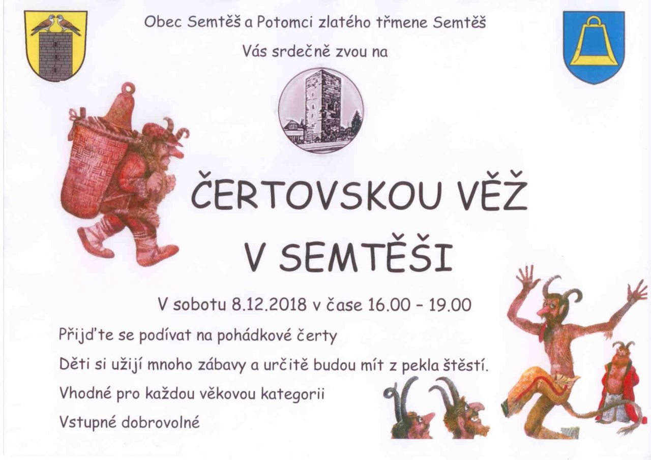 V sobotu 8. 12. 2018 v čase 16,00/19,00 na věži v Semtěši. Přijďte se podívat na pohádkové čerty. Vstupné dobrovolné