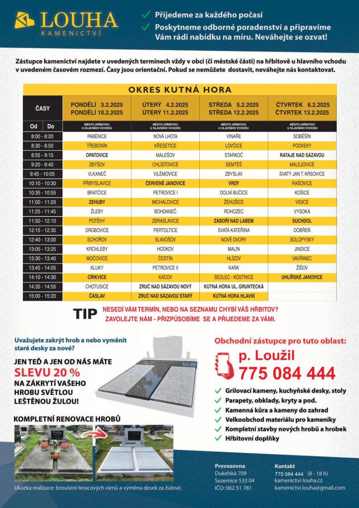 Dne 3.2.2025 a 13.2.2025 přijede na hřbitov v Semtěši zástupce Kamenictví Louha s.r.o. v čase 9:20 - 9:40.