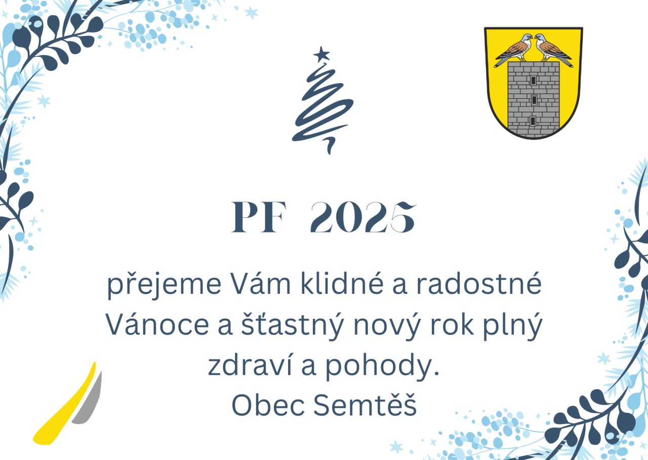 Obec Semtěš přeje klidné a radostné Vánoce a šťastný nový rok 2025. Všem přejeme hodně zdraví, pohody a krásných chvil v kruhu rodiny a přátel. Nechť nový rok přinese štěstí a spokojenost do vašich domovů.