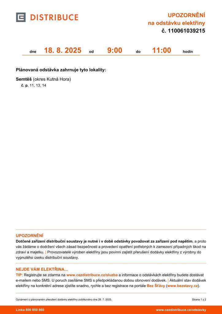Oznámení o přerušení dodávky elektrické energie č. 110061039215