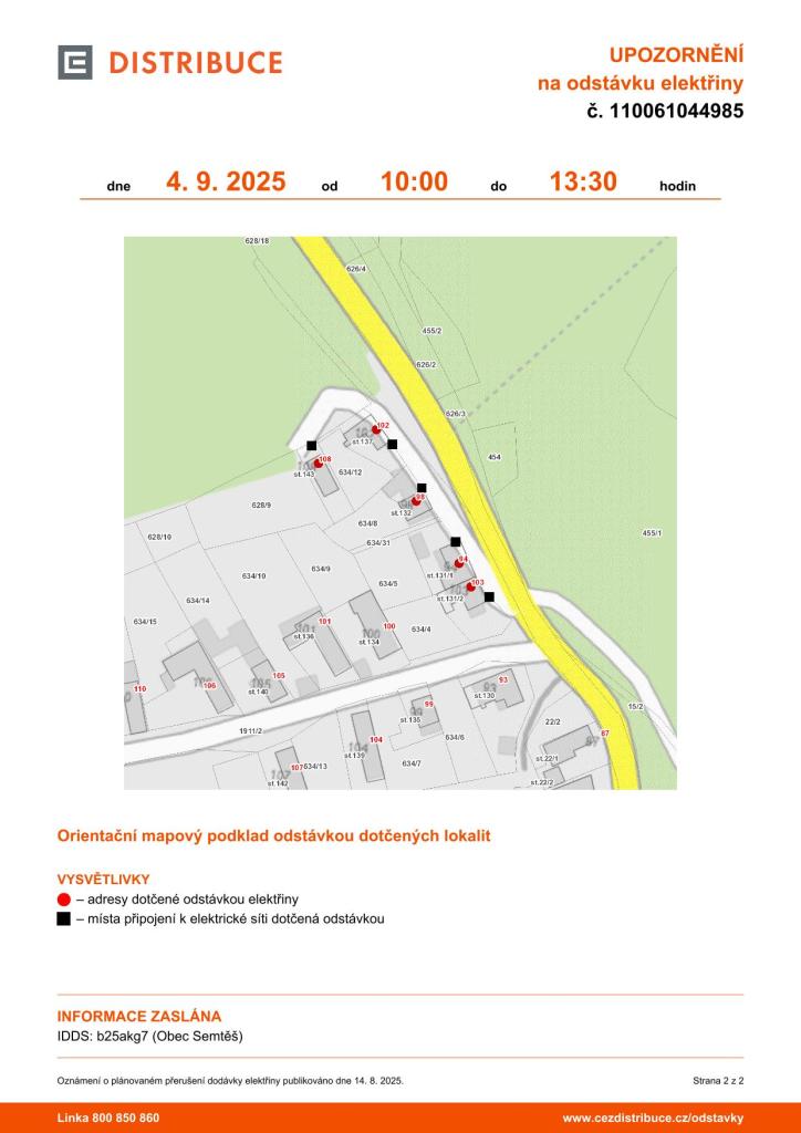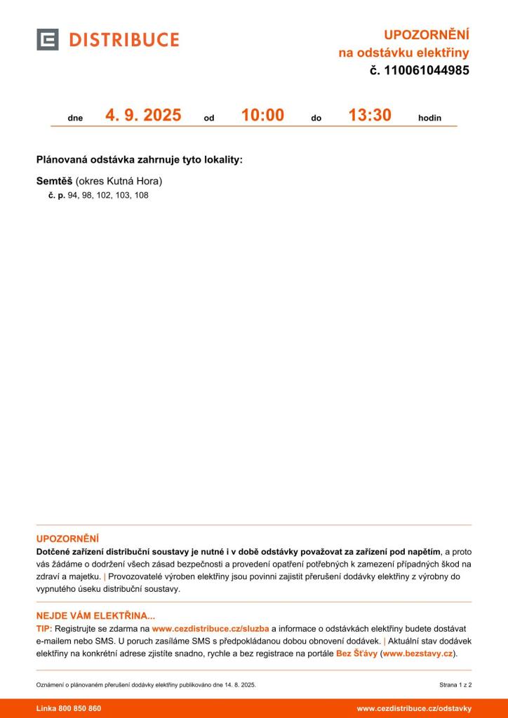 Oznámení o přerušení dodávky elektrické energie č. 110061044985