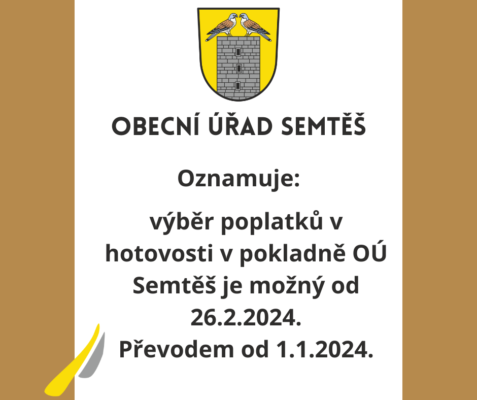 Platba v hotovosti v pokladně OÚ Semtěš od 26.2.2024