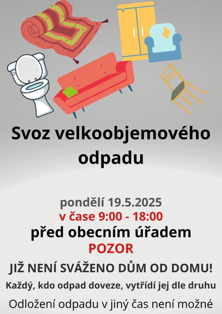 V pondělí 19. května 2025 se od 9:00 do 18:00 uskuteční svoz velkoobjemového odpadu před obecním úřadem.