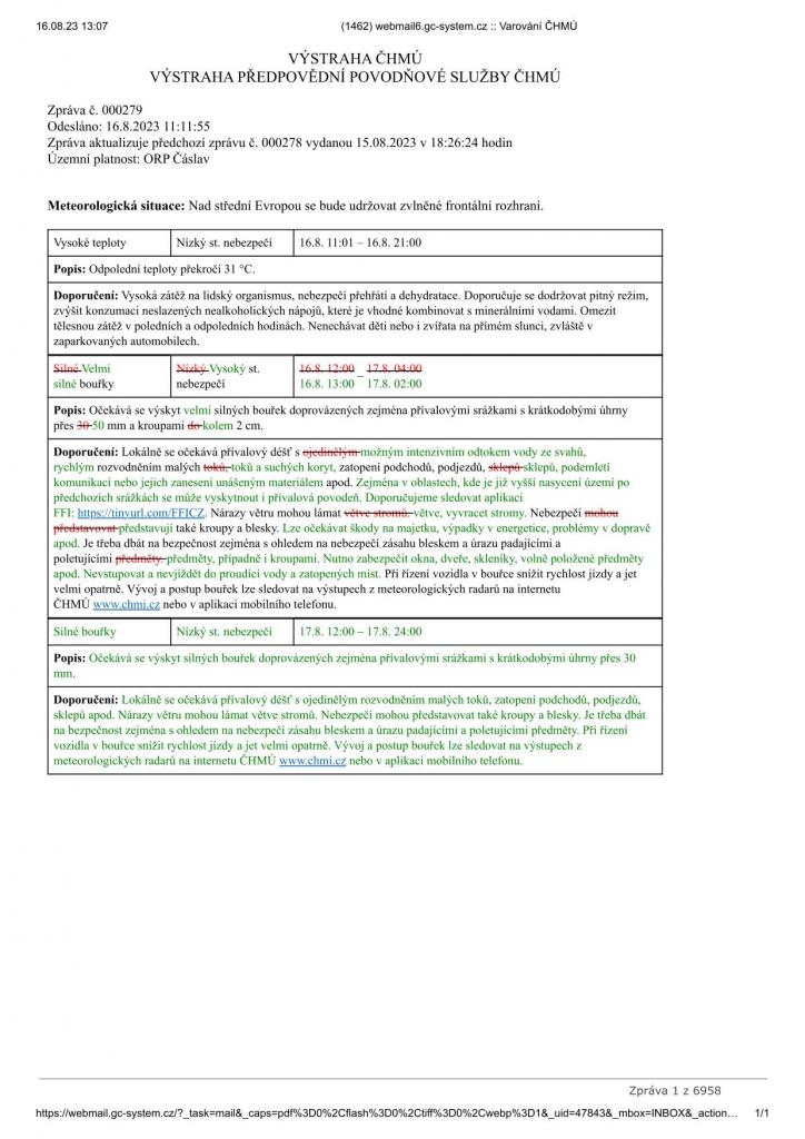 VÝSTRAHA PŘEDPOVĚDNÍ POVODŇOVÉ SLUŽBY ČHMÚ