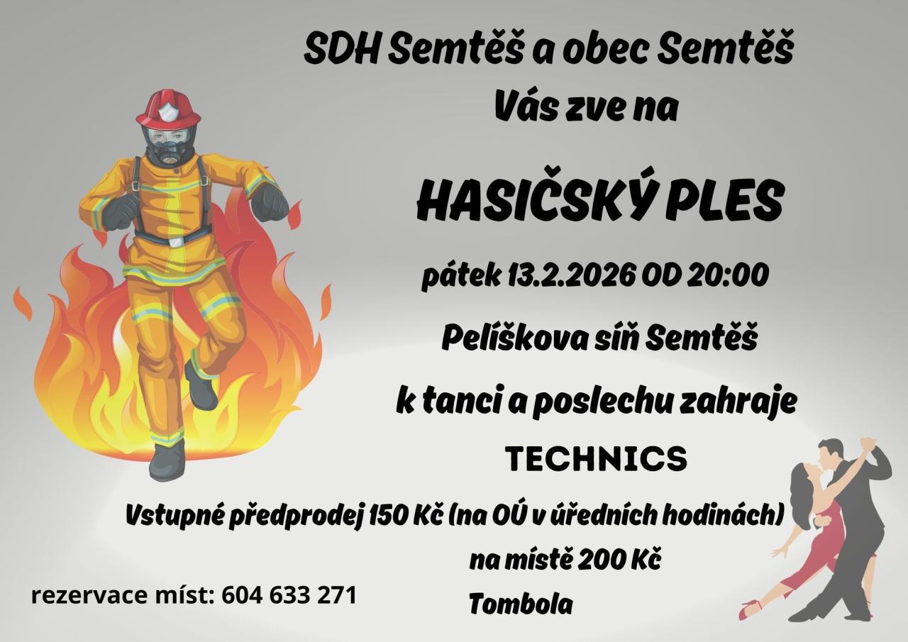 Obec Semtěš a SDH Semtěš srdečně zvou na Hasičský ples, který se uskuteční v pátek 13. února 2026 od 20:00 hodin v Pelíškově síni v Semtěši. K tanci a poslechu zahraje oblíbená skupina Technics. Vstupné činí 150 Kč v předprodeji na Obecním úřadě a 200 Kč na místě. Pro rezervaci míst je k dispozici t