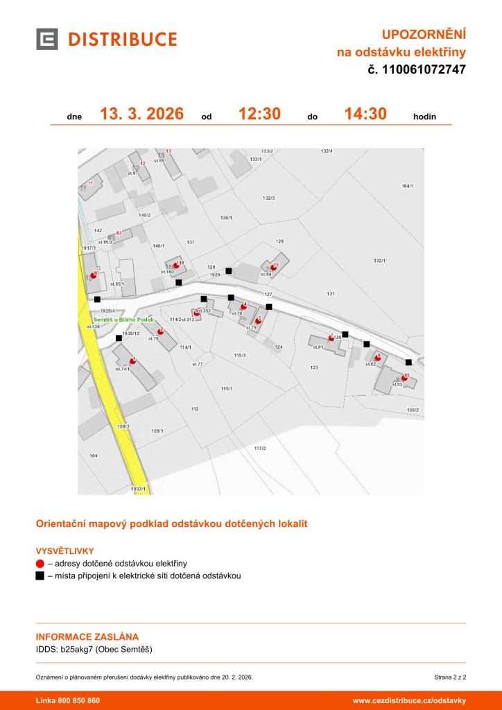 Informujeme Vás o plánovaném přerušení dodávky elektrické energie v katastru Vaší obce, které proběhne dne 13. března 2026 od 12:30 do 14:30. Všechny dotčené oblasti jsou uvedeny v příloze této zprávy.