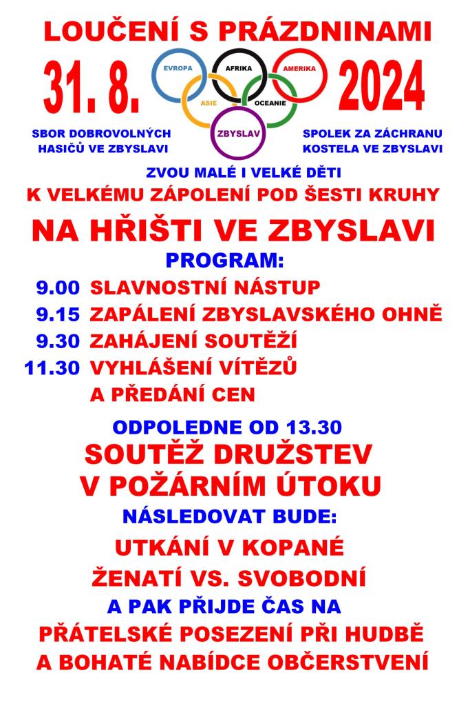 SDH Zbyslav a Spolek za záchranu kostela ve Zbyslavi zvou na loučení s prázdninami, které se koná 31.8.2024 na hřišti ve Zbyslavi.